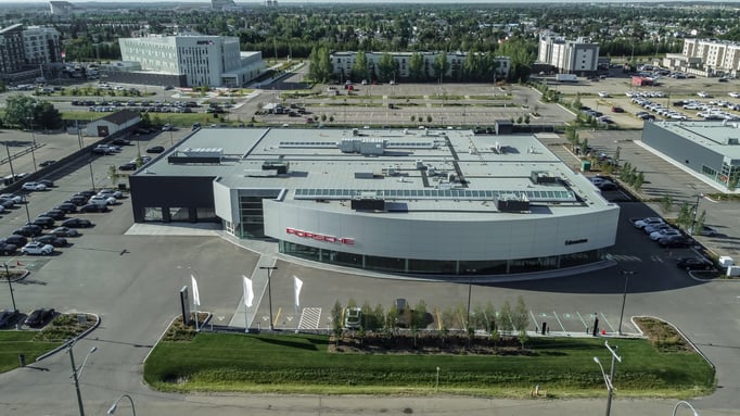 With giant glass windows and distinctive silver facing, you can’t miss the new Porsche Centre Edmonton sitting proudly on Stony Plain Road.