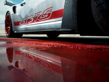Intelligent lightweight construction has been a basic principle of all RS models ever since the legendary 911 Carrera RS 2.7. Thanks to an array of lightweight construction measures such as the extensive use of Carbon-Fibre Reinforced Plastic (CFRP), the 911 GT3 RS weighs in at only 1,525 kg curb weight according to DIN) despite many larger components. The doors, front wings, roof and front lid, for example, are made from CFRP. Lightweight CFRP is also used in the interior, for example in the standard full bucket seats. Furthermore, the new GT sports car is finished in typical RS style: black leather, Racetex and carbon-weave finish carry the purist, sporty ambience inside.