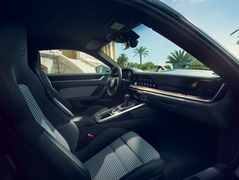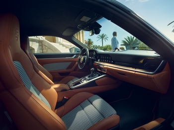 The interior is equally as special as the exterior with materials meant to call back the 1960s and early 1970s including seat centres and door panels with Pepita cloth upholstery. The standard interior of this model uses semi-aniline leather in black and Classic Cognac. This is the first time since the 918 Spyder that Porsche has used this particularly supple and natural feeling grade of leather. A single-tone black leather interior is optional.