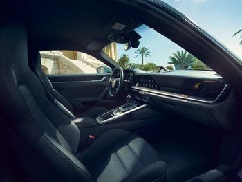 Little details throughout the interior set this car apart. The central, analog tachometer also provides retro style with a white needle and scale markings alongside green numbers and accents. The Sport Chrono clock in the dashboard gets the same treatment. The centre console lid is embossed with the Porsche Exclusive Manufaktur logo, while the headrests are embossed with the Porsche Crest. The door sill plates are also specific to this model, featuring the 911 Sport Classic logo. The sun visors, steering column and even the air vent slats are upholstered in leather. Perforated Race-Tex fabric makes up the headliner and covers the A-, B- and C-Pillars.