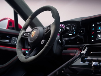 The interior of the Cayenne GTS features a heated GT sports steering wheel as standard. The high-quality material Race-Tex can also be found throughout the car. The suede-like fabric covers the roof lining, armrests, and door panels, as well as the centre panels of the eight-way-adjustable sports seats. The side bolsters have been further raised to offer even more lateral support when cornering. Two alternative, GTS-specific interior packages in Carmine Red or Slate Grey Neo are also available from Porsche for a more customized look.