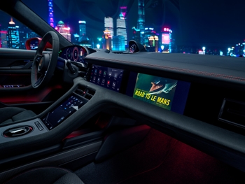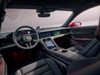 Many of the materials in the interior have been adopted from the Taycan Turbo GT. For example, the Taycan GTS models come standard with extended scopes in sporty Race-Tex and elements in smooth black leather. Also included are the Adaptive Sports Seats Plus (with electric 18-way adjustment), the GT multifunction sports steering wheel with mode switch and steering wheel heating as well as the Sport Chrono package, including the push-to-pass function and track mode. The GT multifunction sports steering wheel, familiar from the Taycan Turbo GT models, is available in black Race-Tex on request. It includes two mode switches and paddles for the push-to-pass function as well as for energy recuperation. In addition to Carmine Red, the optional GTS interior package is now also available in Slate Grey Neo. A Taycan GTS logo is featured in the instrument cluster, power meter and start graphic. The BOSE® Surround Sound System is standard.