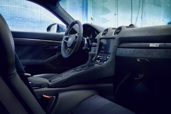 Fidèle au style typiquement RS, la nouvelle 718 Cayman GT4 RS se caractérise par sa légèreté. Ce biplace ne pèse que 1 415 kilos (avec plein d’essence et sans conducteur) conformément à la norme DIN, soit 35 kilos de moins que la 718 GT4 à PDK. Cette réduction de poids provient de l’adoption de pièces plus légères en fibre de carbone renforcée (CFRP), notamment le capot et les ailes avant, et d’une moquette légère, ainsi que de la réduction de la quantité d’isolant. La lunette est en verre léger. Les panneaux de porte légers dotés de sangles en textile et de filets de rangement complètent l’effort d’élimination de tout poids superflu.