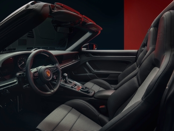 La 911 Edition 50Y Porsche Design sera construite en édition limitée de 750 voitures dotées de nombreuses caractéristiques inspirées des designs emblématiques de F.A. Porsche. Outre son extérieur tout noir, les clins d'œil au passé incluent les classiques panneaux centraux des sièges Sport-Tex à motif quadrillé et l’aiguille des secondes rouge de la montre Porsche Design Sub-second de l’ensemble Sport Chrono livré de série.