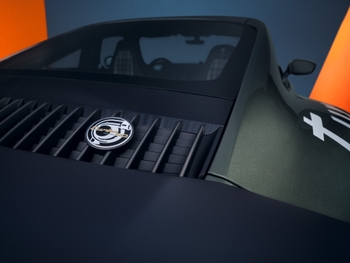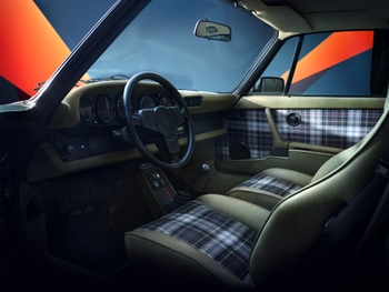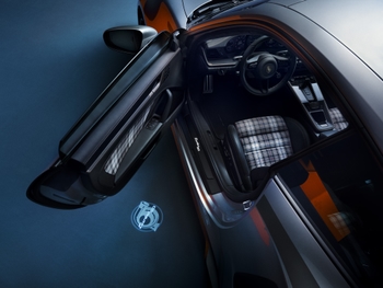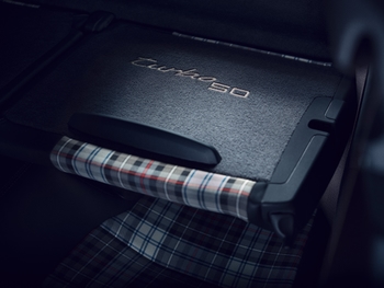 L’intérieur de la 911 Turbo 50 Years est également un reflet de l’histoire de la Turbo. En hommage exclusif aux premiers modèles de la Porsche 911 Turbo, l’emblématique tartan McKenzie orne les panneaux centraux des housses de siège et les panneaux intérieurs de porte. Les contrastes additionnels en Turbonite la distinguent davantage du modèle 911 Turbo S produit en série. Le Turbonite est utilisé sur les ceintures de sécurité, les commandes, les piqûres décoratives, les bandes de garniture avec des appliques décoratives en cuir noir et l’écusson Porsche sur le volant sport GT. Un logo Turbo 50 illuminé vient agrémenter les plaques de bas de porte, qui sont finis en aluminium brossé noir. Le logo est brodé sur l’appuie-tête des sièges sport adaptatifs Plus. Un logo Turbo 50 orne aussi l’arrière du siège arrière gauche. Au-dessus de la boîte à gants se trouve une plaque anniversaire en aluminium, qui porte à la fois le logo Turbo 50 et le numéro d’édition limitée de la voiture sport. Le montant A, les pare-soleil et la garniture de toit sont recouverts de tissu Race-Tex perforé. Une horloge analogique Porsche Design Subsecond au design spécial Turbo 50 orne le tableau de bord.