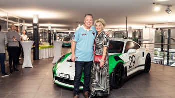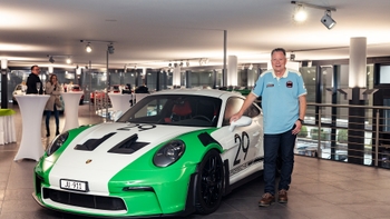 «Die Lackierung mit den vipergrünen Partien, wie der Farbton damals beim 917, gefällt mir sehr gut», freut sich Gilles Salomon bei der Übergabe im Porsche Zentrum Basel. Der Jurassier wurde im Rahmen der Auto Zürich am 9.11. ausgelost und gewann damit das Kaufrecht an dem exklusiven Sondermodell.