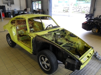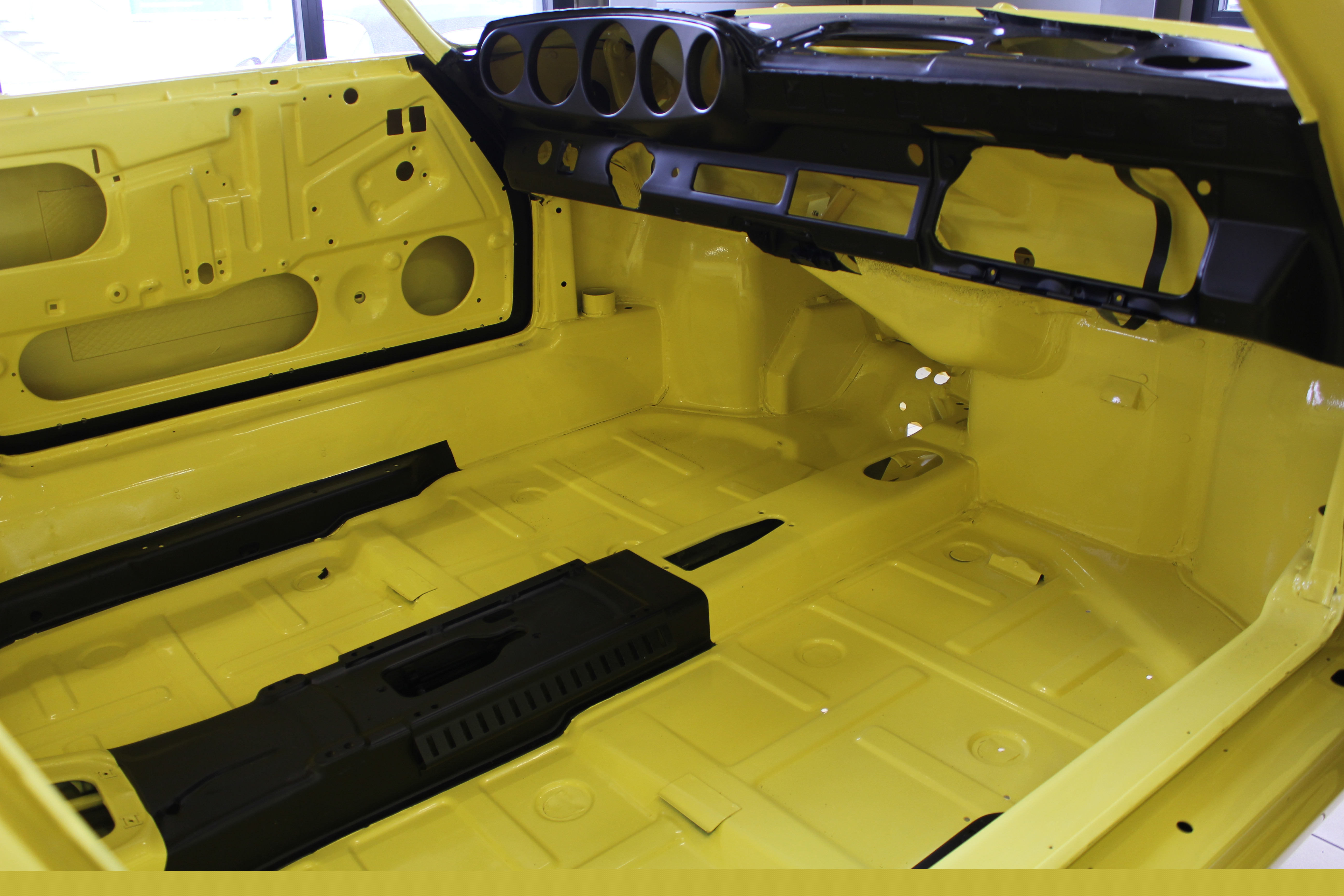 Afin que la belle retrouve sa robe d’antan, nos spécialistes appliquent successivement une couche d’époxy (pour protéger la voiture contre la rouille), du surfacer (pour préparer la voiture au giclage définitif de la peinte) et enfin le giclage de la fameuse peinture jaune Hellgelb!