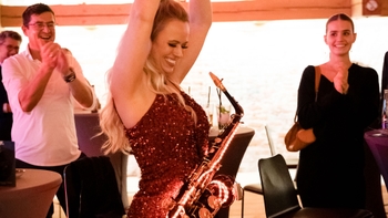 Emotionen pur ab dem ersten Meter: Pünktlich zum Sonnenuntergang trafen die Gäste um 18.30 Uhr ein und wurden mit einem Begrüßungsaperitif, vorbei an der Fotowand, in die obere Etage gelotst. Dort wurde per Flying Buffet die Vorspeise serviert und der Abend offiziell eröffnet. Moderatorin Sylvia Walker und Geschäftsführer Kevin Burns hießen die Gäste herzlich willkommen und gaben einen Überblick über den Ablauf des Abends. Der Höhepunkt der Veranstaltung rückte immer näher.