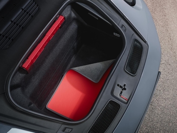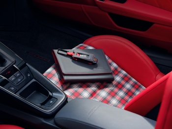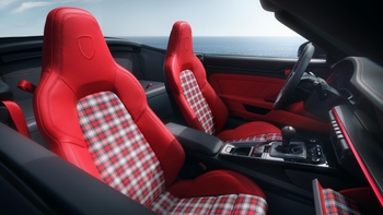 Az utastérben az Adaptive Sports Seats Plus ülések vonzzák a tekintetet, melyeken hímzett Porsche címer található. Az ülések középső paneljeit négyárnyalatú fonott bőr borítja Slate Grey, Guards Red, Magnesium Grey és Kalahari színekben. Ez a gondosan kivitelezett megoldás a kesztyűtartóban is megtalálható. Emellett az utastér szinte teljes egészében kéttónusú bőrrel borított Slate Grey és Guards Red színekben. A kontrasztos díszvarrás, az ajtóbehúzók, az ülésfogantyúk és a biztonsági övek szintén Guards Red színben készültek. A kormányoszlop borítása, az üléskonzol, a belső küszöbborítás és a biztosítékdoboz fedél mind bőrrel vannak borítva – akárcsak a légbeömlők, beleértve a lamellákat is. A szőnyegek szegélyezése is bőrből készült. A napellenzők, a belső visszapillantó tükör konzolja és a szélvédőkeret, valamint a kabriótető belső borítása perforált Slate Grey Race-Tex anyaggal lett bevonva.