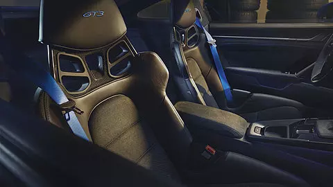 GT3-specific customisable options include a lightweight roof made of exposed carbon fibre. Other highlights include exterior mirror tops made of carbon, darkened LED matrix main headlights and matching Exclusive design rear light with an arc of light with no red components. The black alloy wheels can be enhanced with Guards Red or Shark Blue painted wheel rims.