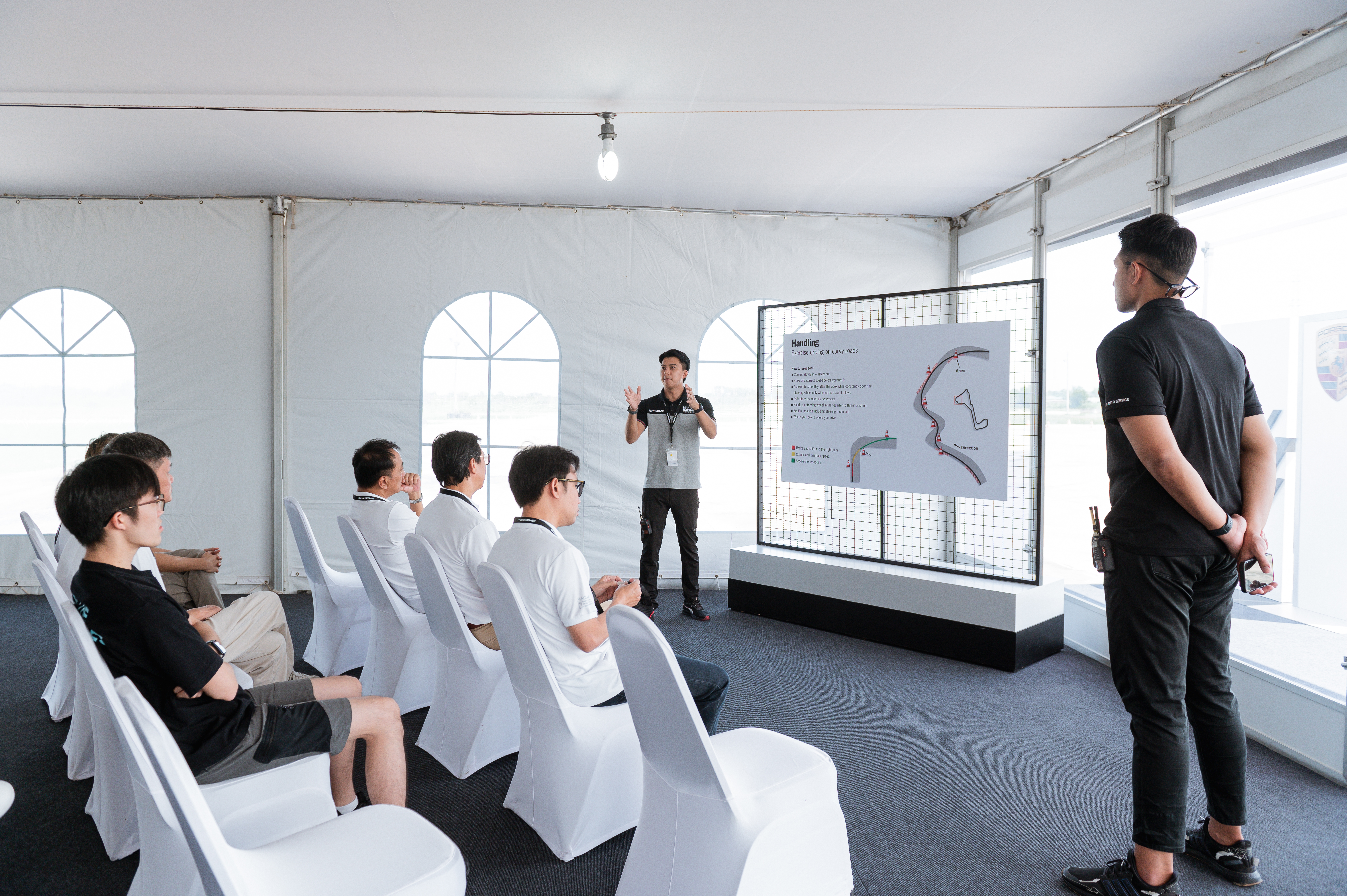 ‘Porsche Driving Experience’ จัดขึ้นระหว่างวันที่ 11-13 กันยายน 2567 เปิดโอกาสให้ผู้เข้าร่วมได้ทดลองขับและสัมผัสประสบการณ์การขับขี่ที่ครอบคลุมทุกมิติ ตั้งแต่สมรรถนะของรถ ฟังก์ชันการใช้งานที่หลากหลาย อุปกรณ์เสริมเพื่อความสะดวกสบาย ไปจนถึงความหรูหราในห้องโดยสาร ซึ่งแสดงให้เห็นถึงความเป็นผู้นำในด้านนวัตกรรมยานยนต์สปอร์ต การทดสอบแบ่งออกเป็น 3 สถานีหลัก ได้แก่ สถานี Handling ที่ทดสอบการควบคุมรถและประสิทธิภาพการทรงตัวของรถในขณะเร่งความเร็วและเลี้ยวอย่างรวดเร็ว พร้อมระบบ Porsche Active Suspension Management (PASM) ที่ช่วยเพิ่มการยึดเกาะถนนและความมั่นคงในการขับขี่, ส่วนสถานี Braking เน้นการเสริมความมั่นใจด้วยระบบเบรกมาตรฐานของปอร์เช่ที่ได้รับการยอมรับระดับโลก ผู้เชี่ยวชาญจะให้คำแนะนำวิธีการเบรกในสถานการณ์ฉุกเฉินและกะทันหันอย่างถูกต้องและปลอดภัย, ปิดท้ายด้วยสถานี Slalom ที่ทดสอบความแม่นยำในการควบคุมรถและการตอบสนองของช่วงล่าง เพื่อการหลบสิ่งกีดขวางอย่างมีประสิทธิภาพ และแสดงศักยภาพการทรงตัวอันยอดเยี่ยมของรถปอร์เช่