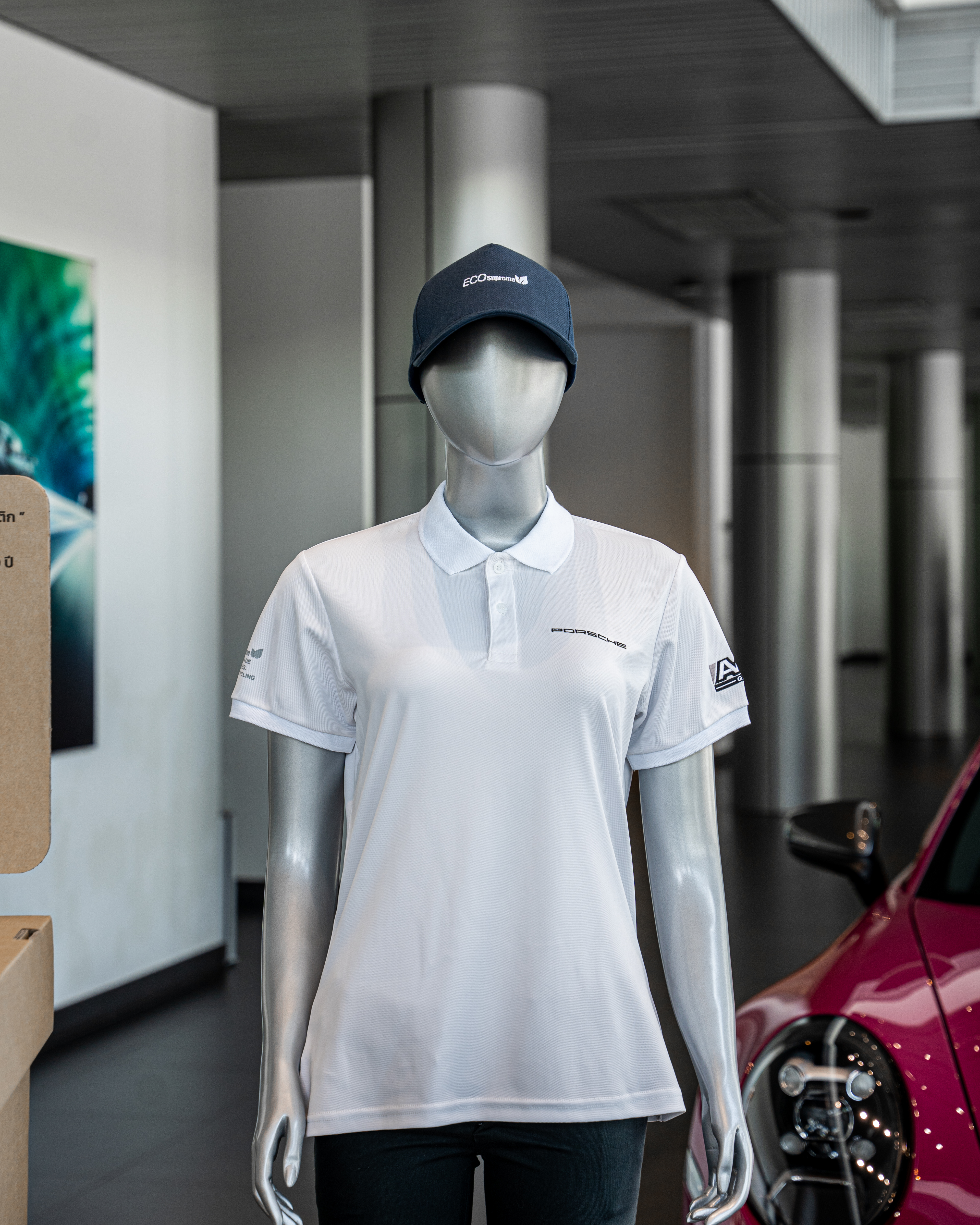 ในกิจกรรม ‘Porsche Driver’s Safety Training’ ผู้เข้าร่วมทุกท่านได้รับเสื้อโปโลพิเศษสำหรับสวมใส่ตลอดการทำกิจกรรม ซึ่งเอเอเอสฯ ได้ร่วมมือกับอีโค ซูพรีม (ECO Supreme) โดยบริษัท แกรนดี้อินเตอร์เทรด จำกัด (Grandy Intertrade) ในการผลิตเสื้อที่เน้นแนวทางความยั่งยืน เสื้อโปโลนี้ผลิตจากเส้นใยผ้าที่ถักทอร่วมกับเส้นใยพลาสติกรีไซเคิล โดยใช้ขวดน้ำพลาสติกเฉลี่ย 15 ขวดต่อเสื้อ 1 ตัว ซึ่งขวดเหล่านี้มาจากขวดน้ำพลาสติกปอร์เช่ที่เอเอเอสฯ ให้บริการในโชว์รูมทั้ง 4 สาขา ได้แก่ Porsche Centre Bangkok, Porsche Centre Pattanakarn, Porsche Studio Siam Paragon และ Porsche Studio Bangkok ICONSIAM นอกจากนี้ ยังได้จัดจุดเก็บขวดน้ำพลาสติกหน้างาน เพื่อให้ผู้เข้าร่วมมีส่วนร่วมในการรีไซเคิลสำหรับโครงการในอนาคต การริเริ่มนี้สะท้อนถึงความรับผิดชอบต่อสิ่งแวดล้อม และเป็นก้าวสำคัญสู่การพัฒนาที่ยั่งยืนของเอเอเอส-กรุ๊ปและสมาชิกครอบครัวเอเอเอสฯ ทุกท่าน